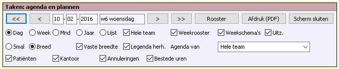 | Week | Toont een werkweek in de agenda voor een geselecteerde medewerker of kamer |