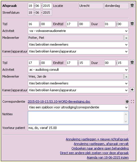 Na het inplannen van de afspraak wijzigen de blauwe linkjes die rechts onderin het blok staan. Met deze linkjes kunnen acties op de afspraak worden ondernomen.
