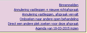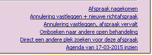 Onderin het afspraakblok is altijd een aantal links zichtbaar. Welke dit zijn is afhankelijk van het moment waarop je ze bekijkt ten opzichte van de afspraakdatum (als het tijdstip van de afspraak voorbij is staan er nieuwe links) en je AC. De links worden hier besproken.