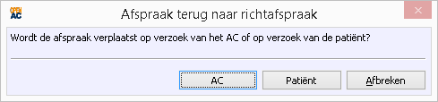 Kies je hier patiënt, wordt de afspraak als Annulering met als reden Verplaatst op verzoek patiënt vastgelegd. Kies je AC, wordt als reden Verplaatst op verzoek AC vastgelegd. Met Afbreken wordt de afspraak met rust gelaten (je annuleert deze actie). Je kunt de reden later veranderen in het blok Annulering. Een nieuwe Richtdatum wordt actief. Je kunt hier op de gebruikelijke manier een nieuwe afspraak vastleggen.