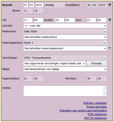 Aan de hand van de ingevulde tijdsduur berekent het programma de totale registratieduur. De normduur wordt berekend op basis van de ingevoerde verrichtingencodes.