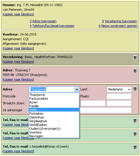 Onderin het blok met cliëntgegevens staan de links voor het toevoegen van de contactgegevens: 3 Adres toevoegen en 4 Telefoon/fax/email toevoegen. In het voorbeeld is voor de cliënt al een adres en een telefoonnummer, emailadres en website ingevoerd. Door te klikken op de link 3 Adres toevoegen wordt een nieuw adresblok actief. Hierin kan een ander adres worden toegevoegd, zoals bijvoorbeeld een apart postadres. Op deze manier kunnen voor elke cliënt verschillende adressen en telefoonnummers, emailadressen of andere contactgegevens worden ingevoerd.