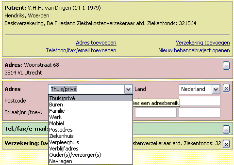 Onderin het blok met patiëntgegevens staan de links voor het toevoegen van de contactgegevens: Adres toevoegen en Telefoon/fax/email toevoegen. In het voorbeeld is voor de patiënt al een adres en een telefoonnummer, emailadres en website ingevoerd. Door te klikken op de link Adres toevoegen wordt een nieuw adresblok actief. Hierin kan een ander adres worden toegevoegd, zoals bijvoorbeeld een apart postadres. Op deze manier kunnen voor elke patiënt verschillende adressen en telefoonnummers, emailadressen of andere contactgegevens worden ingevoerd.