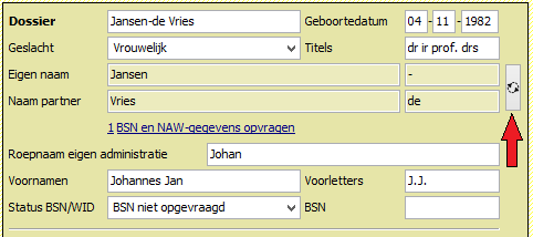 De eerste gegevens die moeten worden ingevoerd zijn naam en geboortedatum. Wanneer iemand de eigen naam en de naam van de partner gebruikt, kiest het programma automatisch de naam àchter het streepje als eigen naam. Klopt de volgorde niet, dan kunnen eigen naam en naam partner verwisseld worden door te klikken op de knop naast de namen. Vanaf versie v2.014 kun je ook nog een derde keer klikken op het knopje. Dan blijft de naam ongemoeid. Soms is dat nodig wanneer de naam zelf een streepje '-' bevat. In deze afbeelding is dat laatste niet het geval.