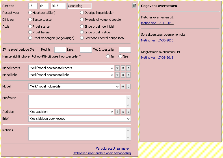 Na het uitvoeren van de meting (of desgewenst direct vanuit het bezoek) kan worden geklikt op Recept aanmaken. Nu verschijnt een blok waarin de gegevens voor een recept kunnen worden ingevoerd. De knop L=R kopieert de gegevens van rechts naar links. Vanuit dit blok kan vervolgens middels een sjabloon een recept worden aangemaakt in Microsoft Word of OpenOffice. Ook bestaat er de mogelijkheid om vanuit een eerder gemaakt recept te klikken op vervolgrecept aanmaken. Dit resulteert in een nieuw receptblok waarbij de gegevens van het eerdere recept zijn gekopieerd. Zo kan men het gehele traject van proefrecept tot definitief recept vastleggen.
