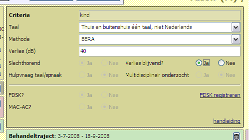 - Slechthorend ja/nee. Wordt automatisch bepaald op basis van methode en verlies: bij BERA een drempel >35dB, bij vrije veld een drempel >30dB en bij overige metingen >25dB.
