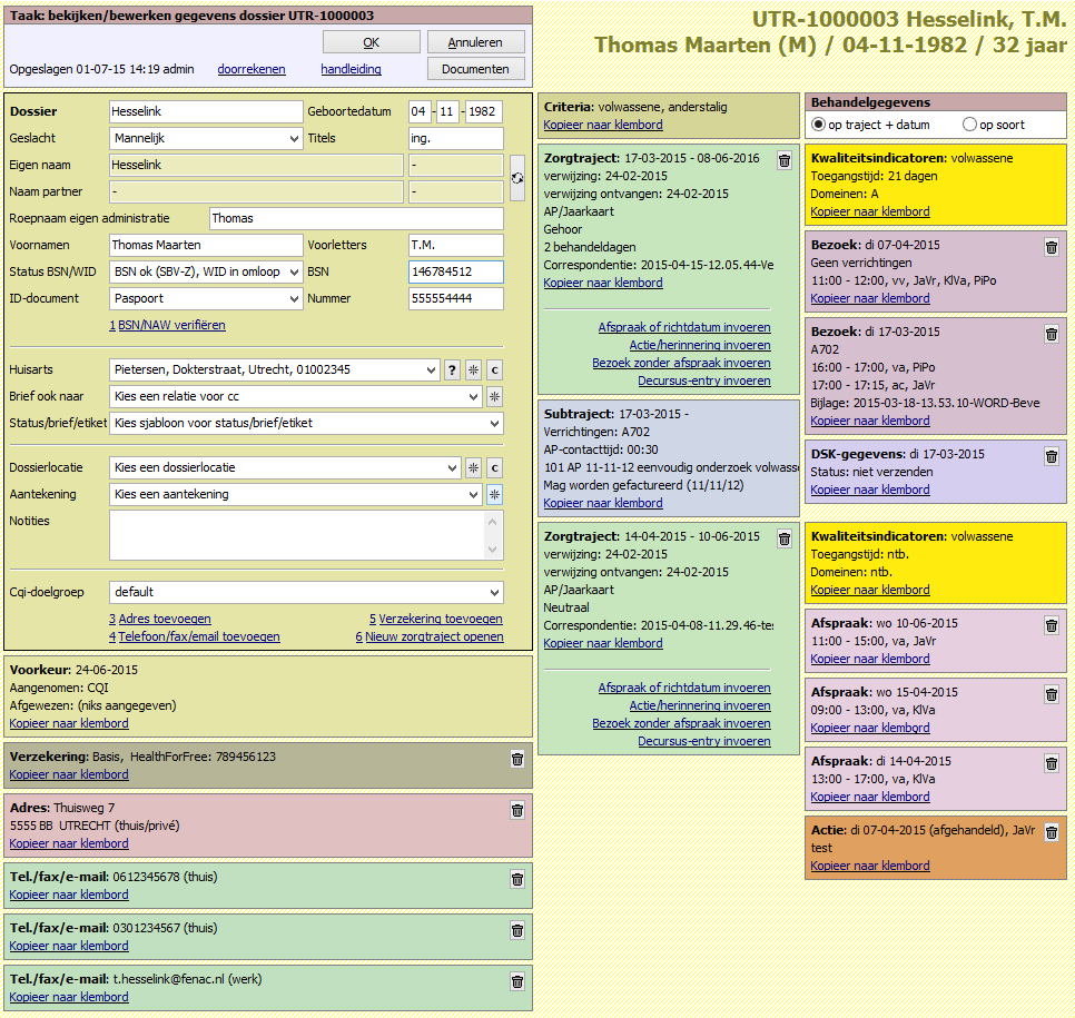 Alle gegevens over een cliënt kunnen in het dossierscherm worden ingevoerd en bekeken. Hier vind je bijvoorbeeld NAW-gegevens, informatie over verwijzingen, (richt)afspraken, informatie over onderzoeken en toesteladviezen. De gegevens zijn verdeeld over drie kolommen. In de eerste kolom staan NAW- en andere basisgegevens, in de tweede kolom de verwijsgegevens (en financieel traject) en in de derde kolom informatie over afspraken, onderzoeken en adviezen. In de linkerkolom staan, als ze zijn ingevuld, onder het grote gele hoofdvak blokjes met adressen, telefoonnummers, andere contactinformatie en verzekeringsgegevens.