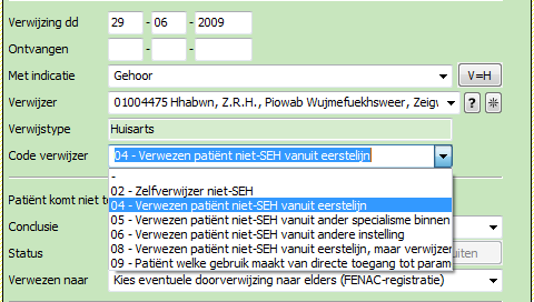| 06 | Verwezen patiënt niet-SEH vanuit andere instelling | Bijvoorbeeld een cliënt die zich meldt bij de polikliniek met een verwijzing van andere instelling. |