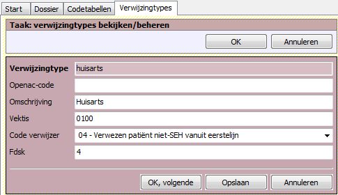 In bovenstaande schermafdruk is te zien dat verwijzingtype huisarts is gekoppeld aan code verwijzer 04. OpenAC gebruikt deze informatie om een default code verwijzer in te vullen in de verwijzing op het moment dat een verwijzer wordt gekozen: