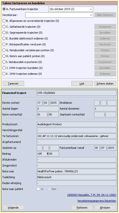 Bij Al gefactureerd zie je of voor dit financiële traject al eerder een nota is verstuurd. Nota naar patiënt laat zien of de nota naar de verzekeraar of de cliënt wordt gestuurd. Bij de Toelichting kunnen uiteenlopende zaken staan. Je ziet hier bijvoorbeeld of de nota elektronisch of op papier wordt verstuurd, maar ook vind je er informatie over ontbrekende (verzekerings)gegevens.
