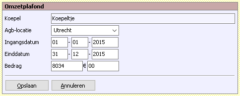 Als eenmaal een koepel is geselecteerd, dan wordt de lijst met omzetplafonds (of omzet-afspraken) gevuld met de afspraken die met die koepel gemaakt zijn. Klik op de knop Nieuw omzetplafond om een nieuwe afspraak (waarschijnlijk voor een nieuwe periode) in te voeren, of klik op een bestaand plafond om de gegevens te bekijken.