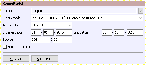 De knop Annuleren gooit een nieuw koepeltarief weg of maakt wijzigingen ongedaan en heft de selectie van een tarief op. De knop Opslaan doet twee dingen: het slaat de koepeltarief-gegevens op en het past de koepelgegevens toe door tarieven (beschikbaar via het tarievenscherm) aan te maken of aan te passen. Het vinkje Forceer update is alleen van belang bij het opslaan.