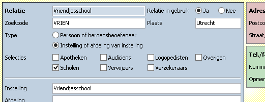 Voer de gegevens in en klik op Zoeken. Is deze relatie nog niet ingevoerd, selecteer Type, Selecties, eventueel een Verwijsfunctie als het een verwijzer is en klik dan vervolgens op Invoeren. Er wordt een nieuw invoerscherm zichtbaar, waarin de gegevens kunnen worden ingevuld.