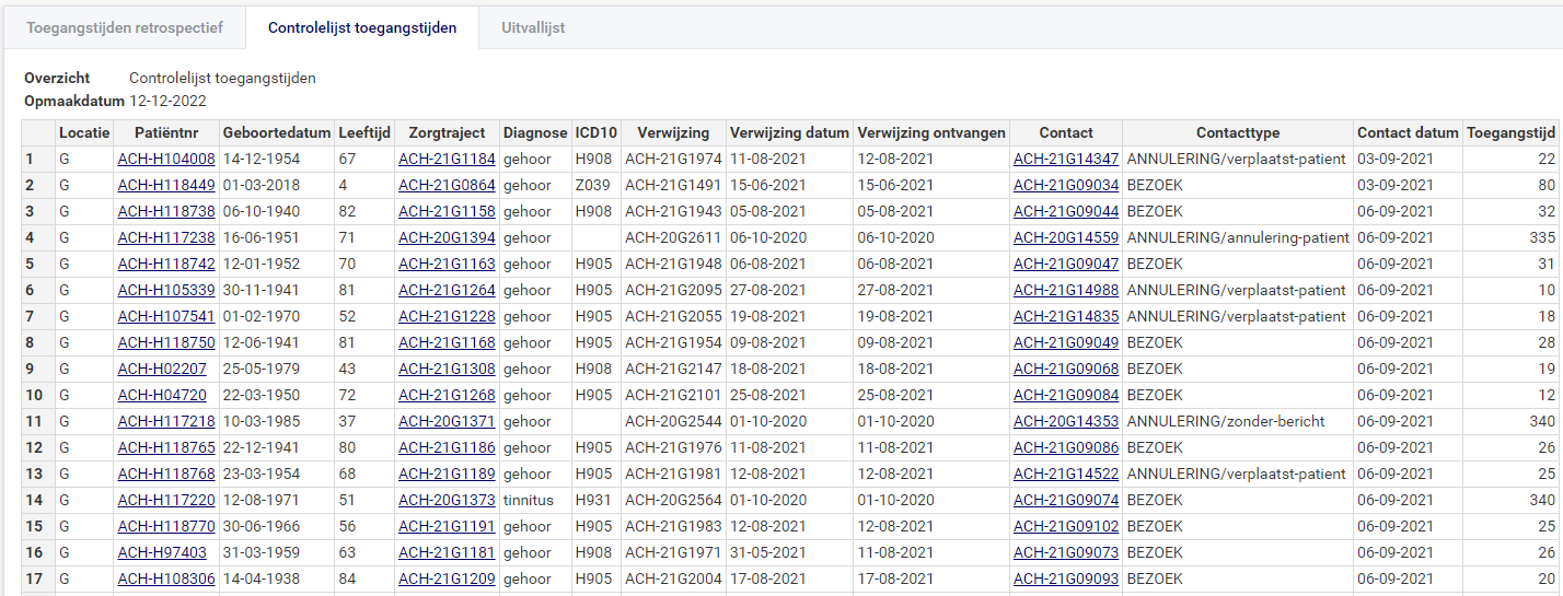 - Patiëntnr opent het dossier van het contact waarvoor de toegangstijd is berekend;