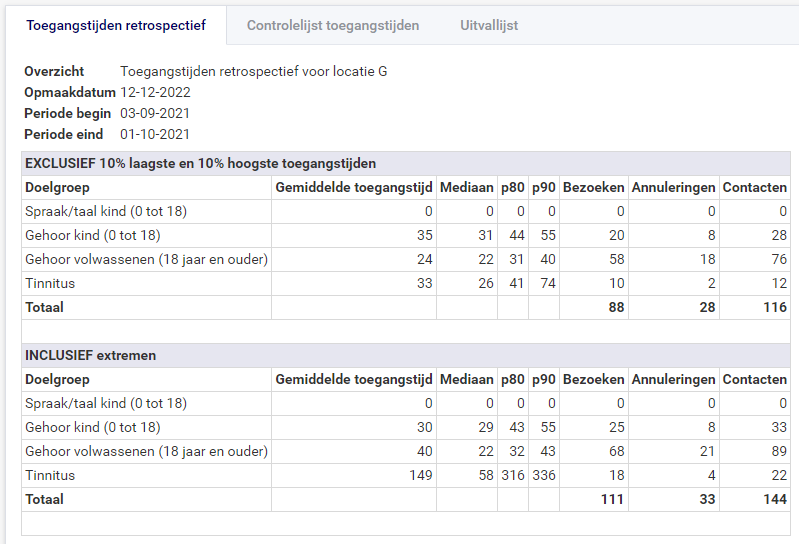 Het tabblad "Toegangstijden retrospectief" bevat twee secties, de toegangstijden ex- en inclusief de extremen.