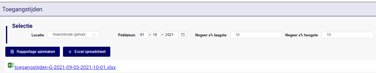 | Negeer x% hoogste | Als hier 10 wordt ingevuld (default) dan worden de 10% hoogste toegangstijden genegeerd (*) |