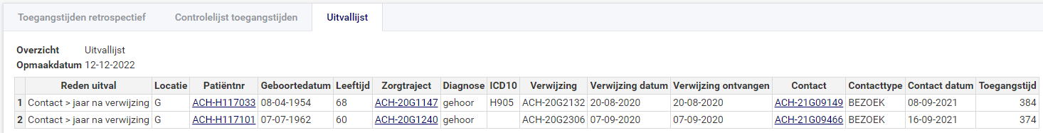 Op het moment van schrijven is er maar één reden dat contacten op de uitvallijst terechtkomen en dat is dat het langer dan een jaar na ontvangst van de verwijzing plaatsvindt. De meest voorkomende reden hiervoor is dat de datum ontvangst niet is ingevuld. Door te klikken op het bijbehorende zorgtraject kan de basisregistratie worden aangevuld en kan de rapportage desgewenst opnieuw worden uitgedraaid.