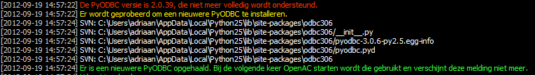 Bij alle starter kits sinds v1.222 zit een Python 2.5 runtime. - Als je een upgrade doet van v2.000 naar v2.002 zijn er nieuwe ODBC drivers nodig. De vorige versie van PyODBC die werd meegeleverd met OpenAC, PyODBC 2.0.39, is al jaren oud en kan niet overweg met de queries die OpenAC tegenwoordig maakt. Bij het opstarten van OpenAC v2.002 wordt automatisch een poging gedaan om PyODBC 3.0.6 van de server van de FENAC op te halen en te installeren onder de Python25 directory. Als deze poging mislukt, wordt verwezen naar de lokale ICTers.