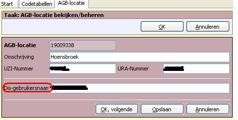 Om met deze nieuwe DIS standaard (v7.0) DIS bestanden te kunnen aanmaken moeten de AC's hun DIS-gebruikersnaam bij de codetabel AGB-locaties invullen. Dat is een verplicht veld dat van DIS moet worden ingevuld. Zie het voorbeeld hieronder: