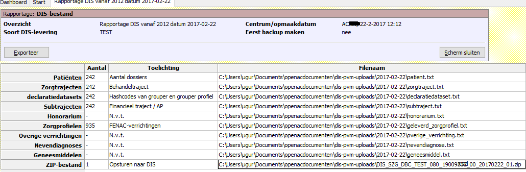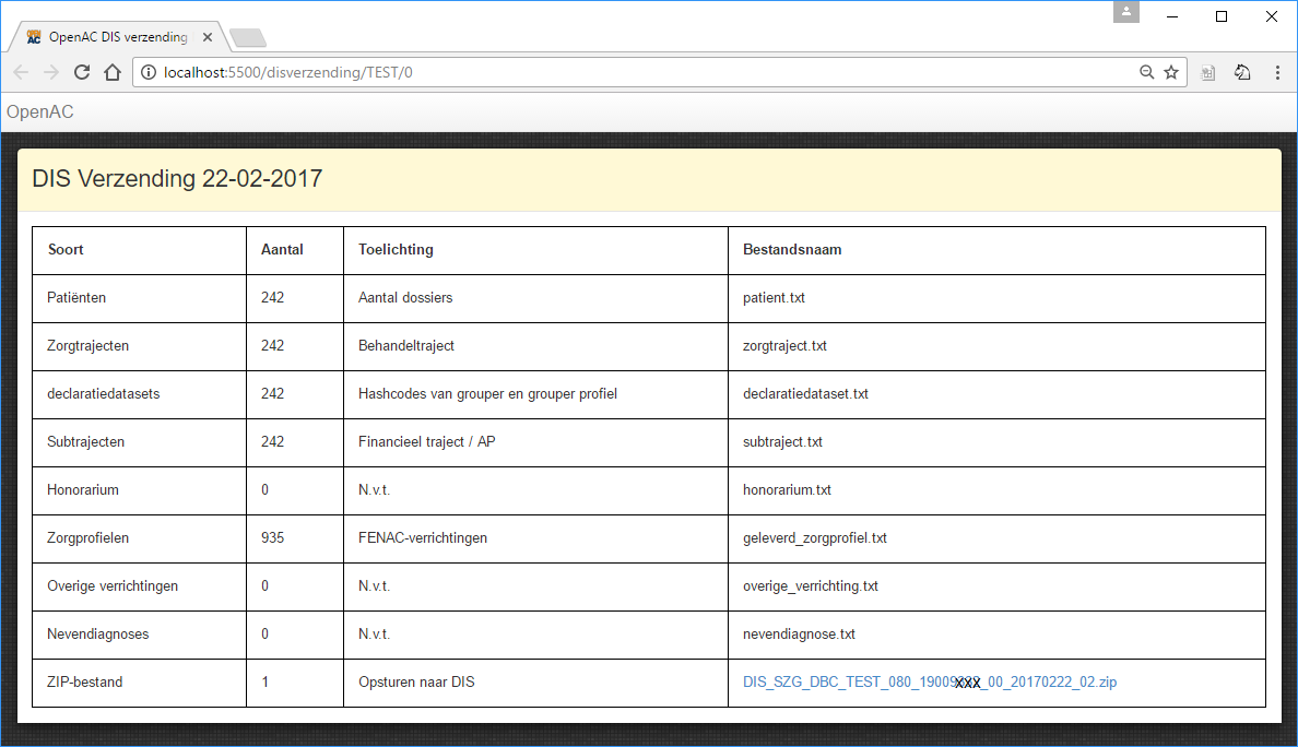 In de nieuwe tabblad staat de aantallen regels die in de gemaakte bestanden staan en er staat ook de naam van het zip-bestand voor het aanleveren. De naam van het zip-bestand ziet als volg uit: