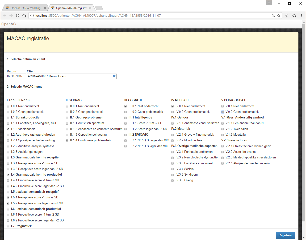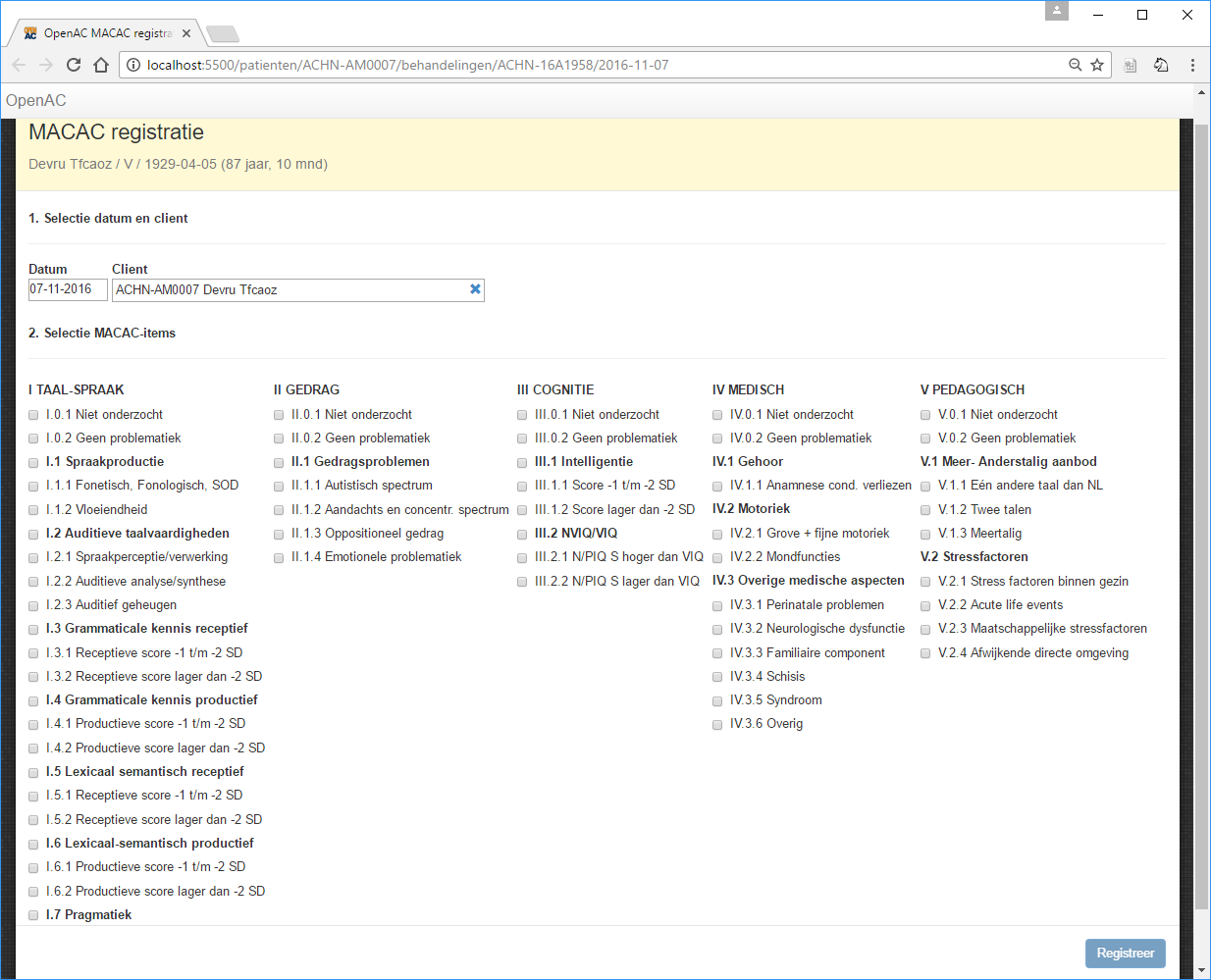 Er is een webbrowser tabblad met patiëntgegevens, datum en een selectie lijst van de MAC-AC items.